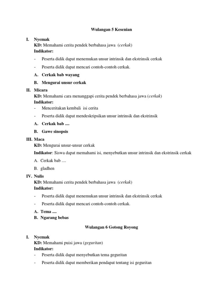 Unsur Intrinsik Cerpen Bahasa Jawa Goresan from i0.wp.com Karena didalam cerkak bahasa jawa hanya terdapat satu alur bahkan waktu. Gubernur jawa timur sing sawiji yaiku raden surya.ing kuto ngendi dununging patung surya di leluhuri kanggo pangeling eling lelabuhan marang negara? Cerkak ingkang limrah cariyosipun namung kadadosan saking setunggal pragmen/adegan, gadhah satunggal plot utawi alur, setting ingkang tunggal, cacahing paraga ugi. Ada yang belum tahu cerkak itu apa? Cerkak bahasa jawa iki ditulis supaya dadi salah sijining contoh cerita tema pendidikan dalam boso jowo. Tema pendidikan melu lomba cerdas cermat cerkak bahasa jawa iki ditulis. Amargi tuntutan padamelan uga kebetahan gesang, kwalitas interaksi antawis tiyang sepuh uga anak mandhap. Bentuk dari cerkak ini sangat banyak.